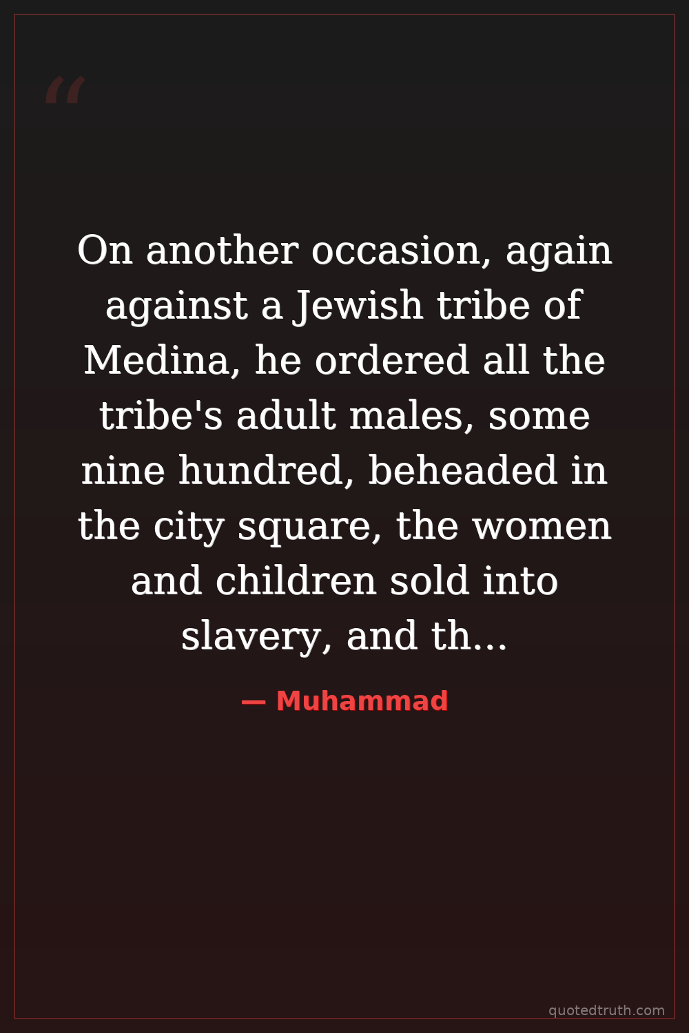 On another occasion, again against a Jewish tribe of Medina, he ordered all the tribe's adult males, some nine hundred, beheaded in the city square, the women and children sold into slavery, and their property distributed among his Muslim followers.