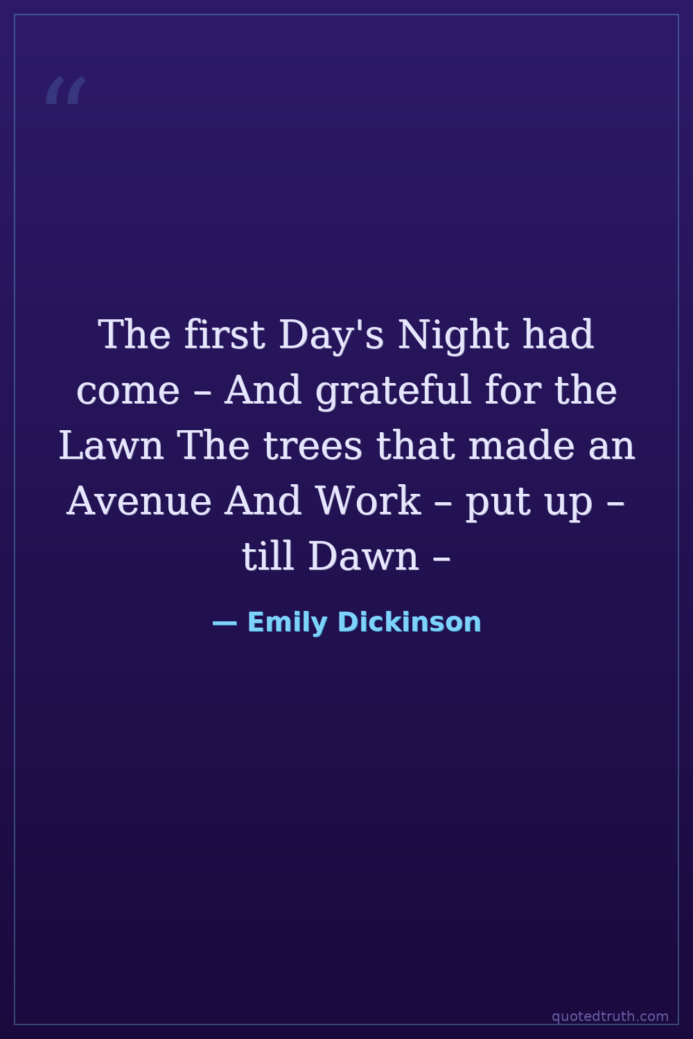 The first Day's Night had come – And grateful for the Lawn The trees that made an Avenue And Work – put up – till Dawn –