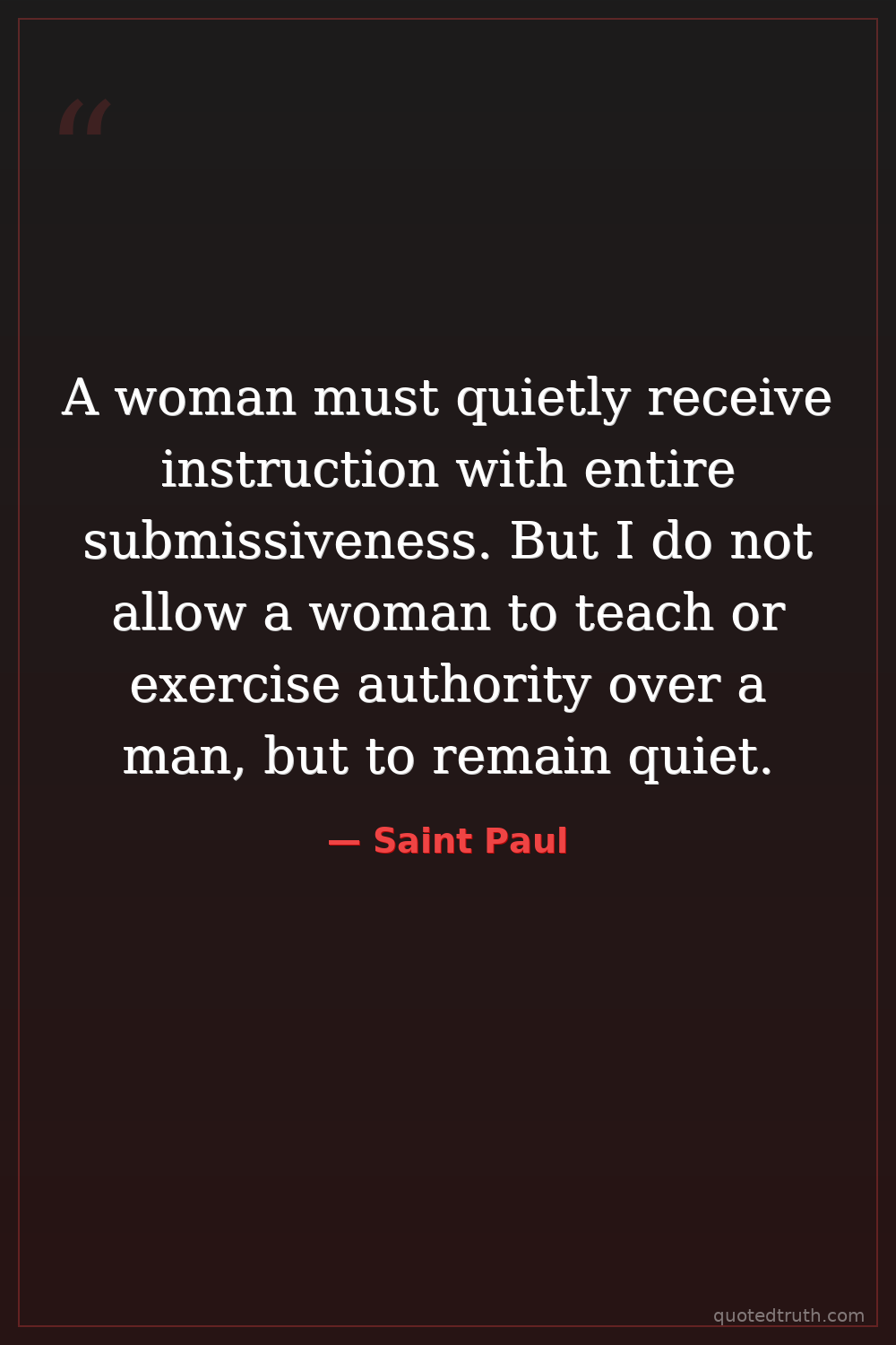 A woman must quietly receive instruction with entire submissiveness. But I do not allow a woman to teach or exercise authority over a man, but to remain quiet.