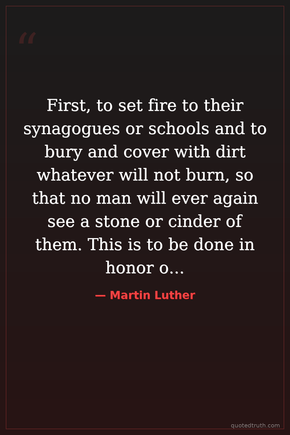 First, to set fire to their synagogues or schools and to bury and cover with dirt whatever will not burn, so that no man will ever again see a stone or cinder of them. This is to be done in honor of our Lord and of Christendom, so that God might see that we are Christians, and do not condone or knowingly tolerate such public lying, cursing, and blaspheming of his Son and of his Christians.