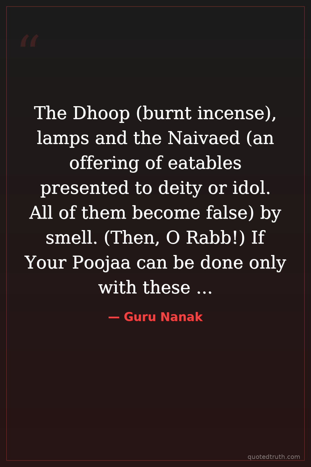 The Dhoop (burnt incense), lamps and the Naivaed (an offering of eatables presented to deity or idol. All of them become false) by smell. (Then, O Rabb!) If Your Poojaa can be done only with these things, then by placing these false things before You) how will Your Bhagat do your Poojaa?