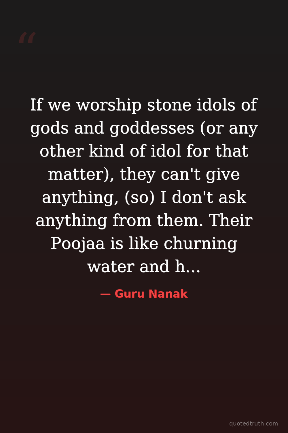 If we worship stone idols of gods and goddesses (or any other kind of idol for that matter), they can't give anything, (so) I don't ask anything from them. Their Poojaa is like churning water and hoping for butter! (These idols) sink themselves in water — how can they save human beings from the world-ocean?