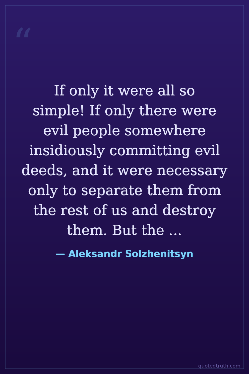 If only it were all so simple! If only there were evil people somewhere insidiously committing evil deeds, and it were necessary only to separate them from the rest of us and destroy them. But the line dividing good and evil cuts through the heart of every human being. And who is willing to destroy a piece of his own heart?