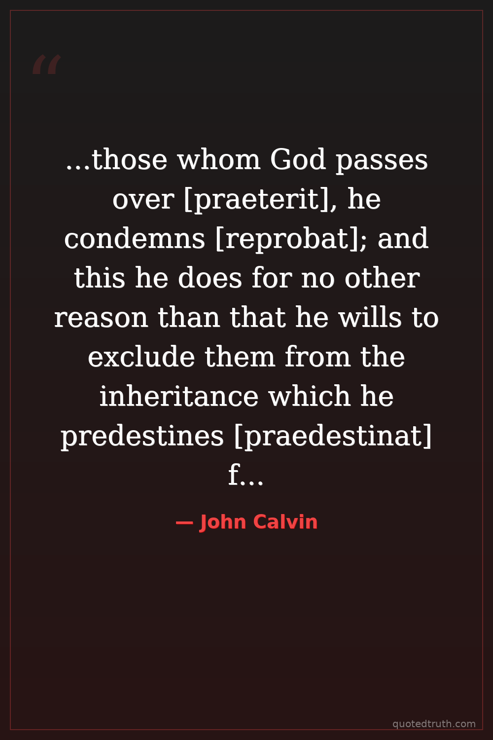 ...those whom God passes over [praeterit], he condemns [reprobat]; and this he does for no other reason than that he wills to exclude them from the inheritance which he predestines [praedestinat] for his own children.