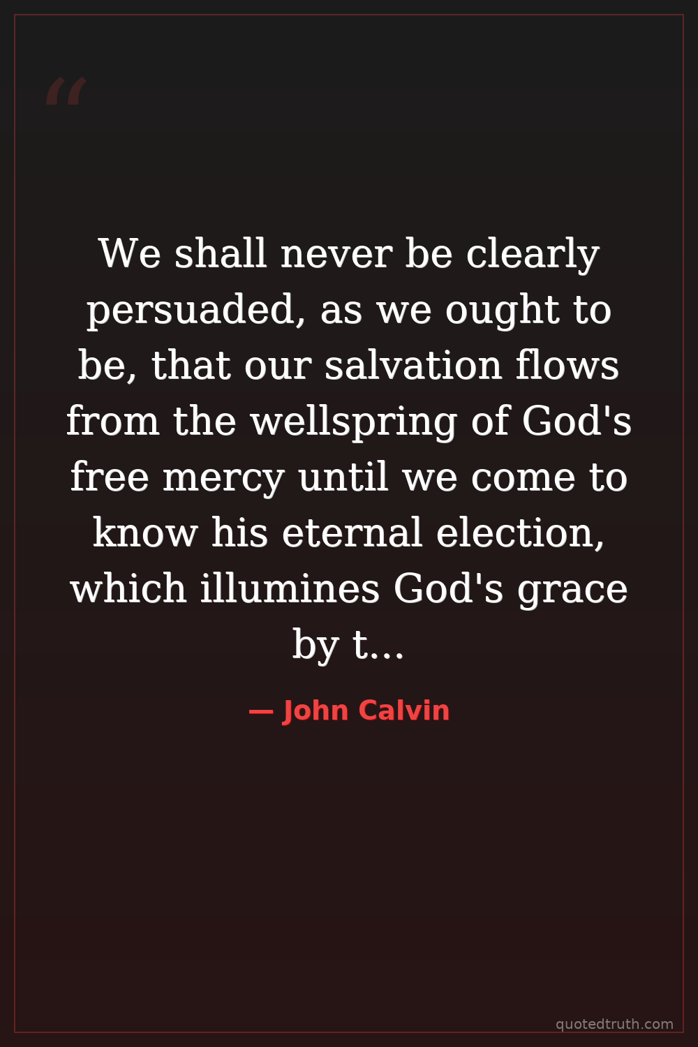 We shall never be clearly persuaded, as we ought to be, that our salvation flows from the wellspring of God's free mercy until we come to know his eternal election, which illumines God's grace by this contrast: that he does not indiscriminately adopt all into the hope of salvation but gives to some what he denies to others.