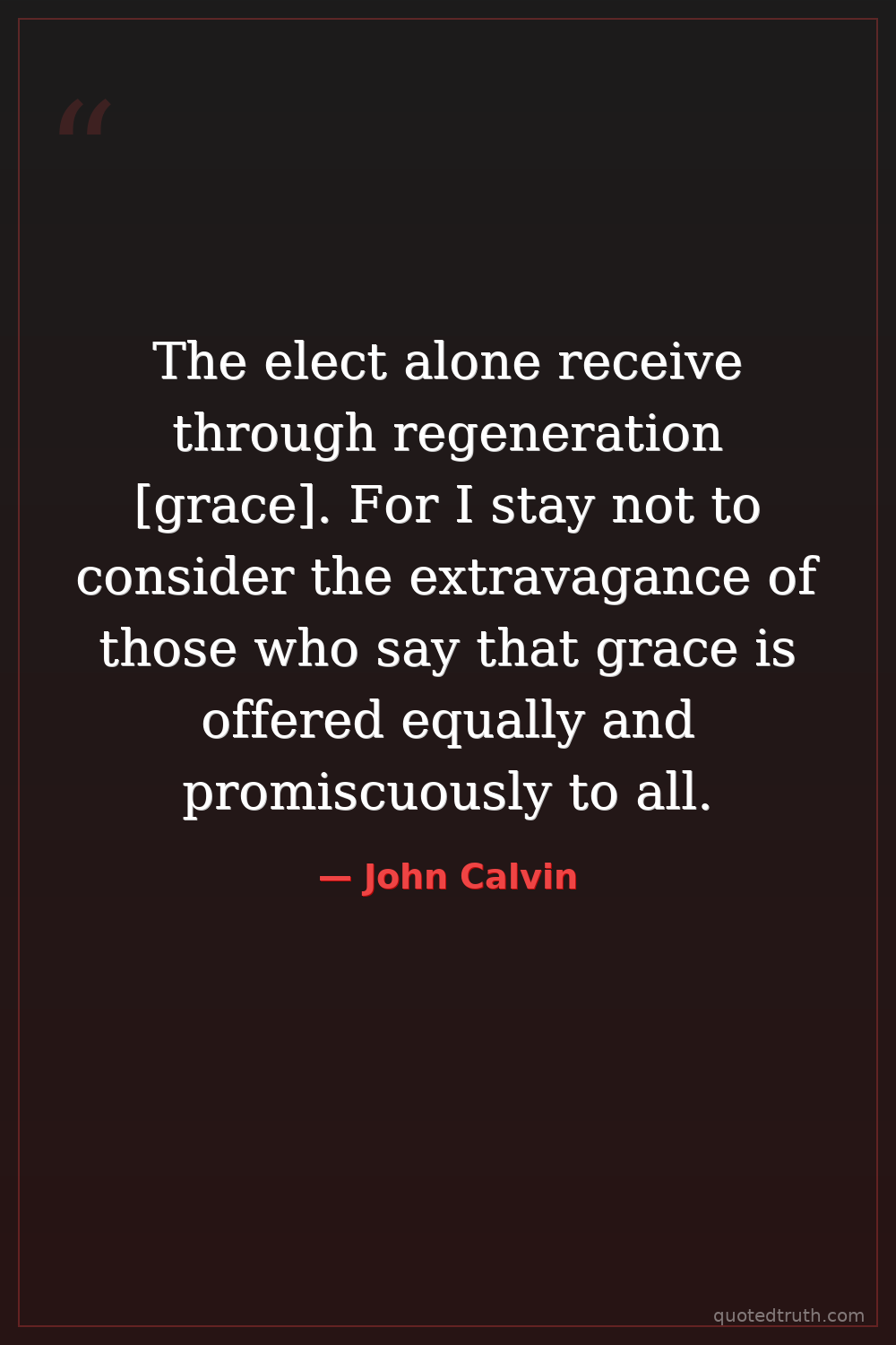 The elect alone receive through regeneration [grace]. For I stay not to consider the extravagance of those who say that grace is offered equally and promiscuously to all.