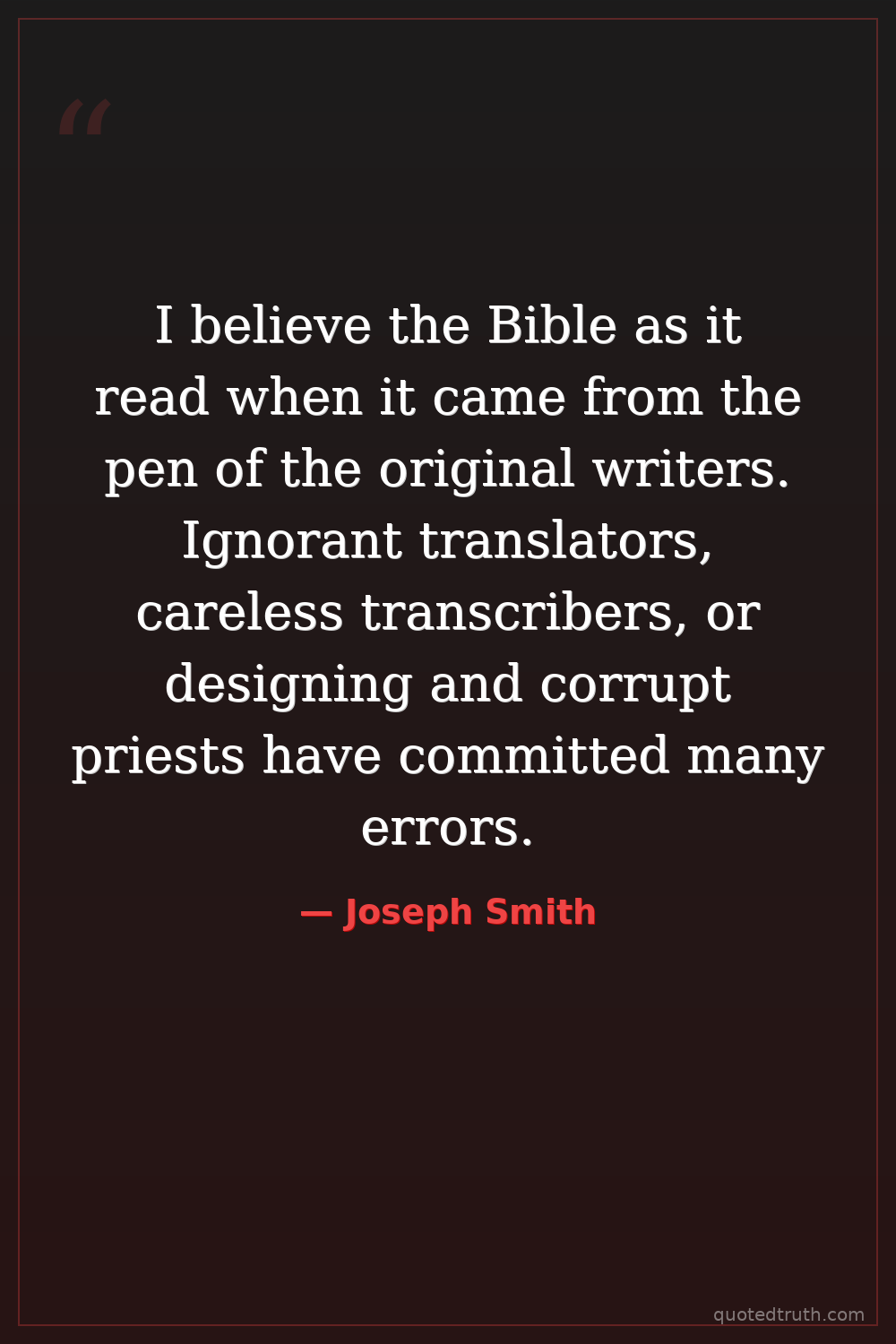 I believe the Bible as it read when it came from the pen of the original writers. Ignorant translators, careless transcribers, or designing and corrupt priests have committed many errors.