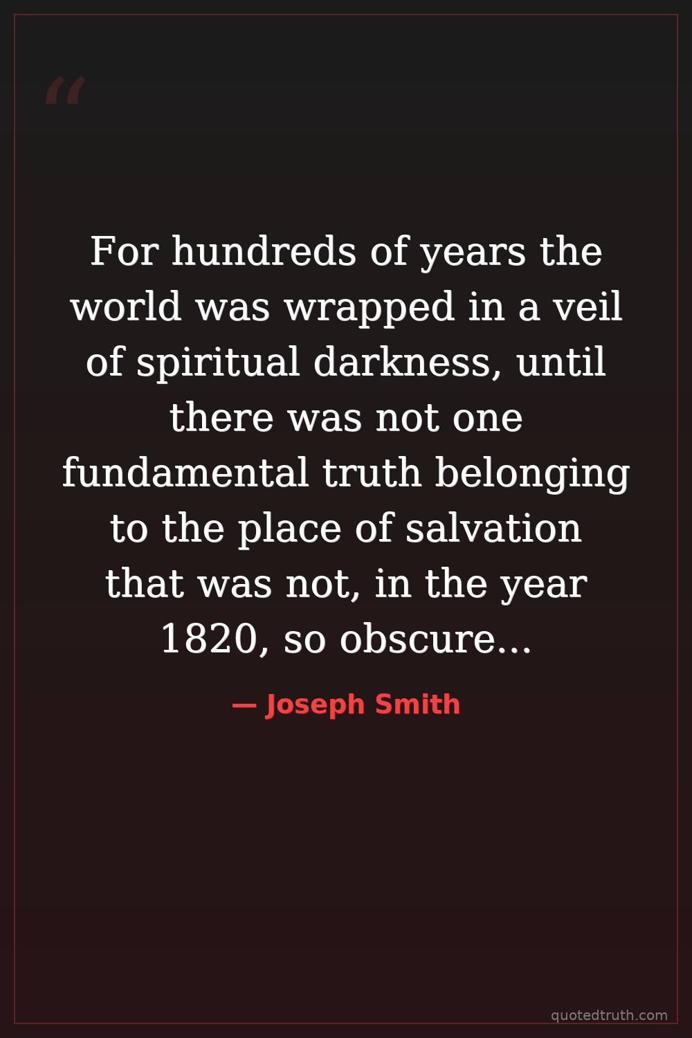 For hundreds of years the world was wrapped in a veil of spiritual darkness, until there was not one fundamental truth belonging to the place of salvation that was not, in the year 1820, so obscured by false tradition and ceremonies, borrowed from paganism, as to make it unrecognizable; or else it was entirely denied.