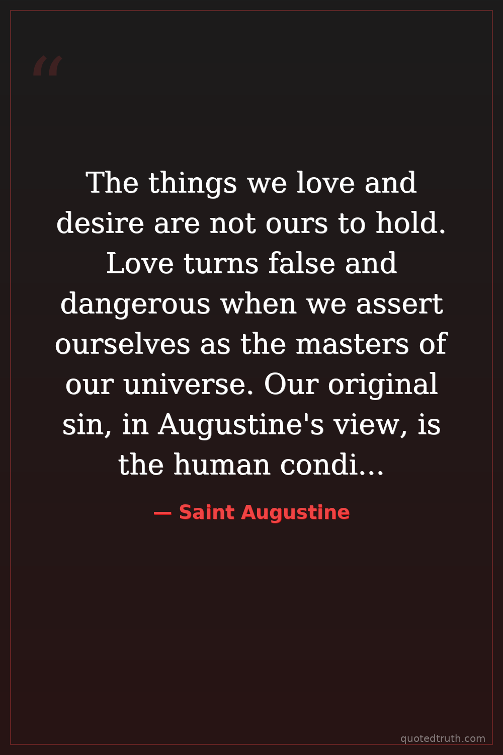 The things we love and desire are not ours to hold. Love turns false and dangerous when we assert ourselves as the masters of our universe. Our original sin, in Augustine's view, is the human condition that reaches for the illusion of power or community but ultimately turns us inward until we annihilate ourselves—rather than turning us outward, toward the eternal horizon of God's love.