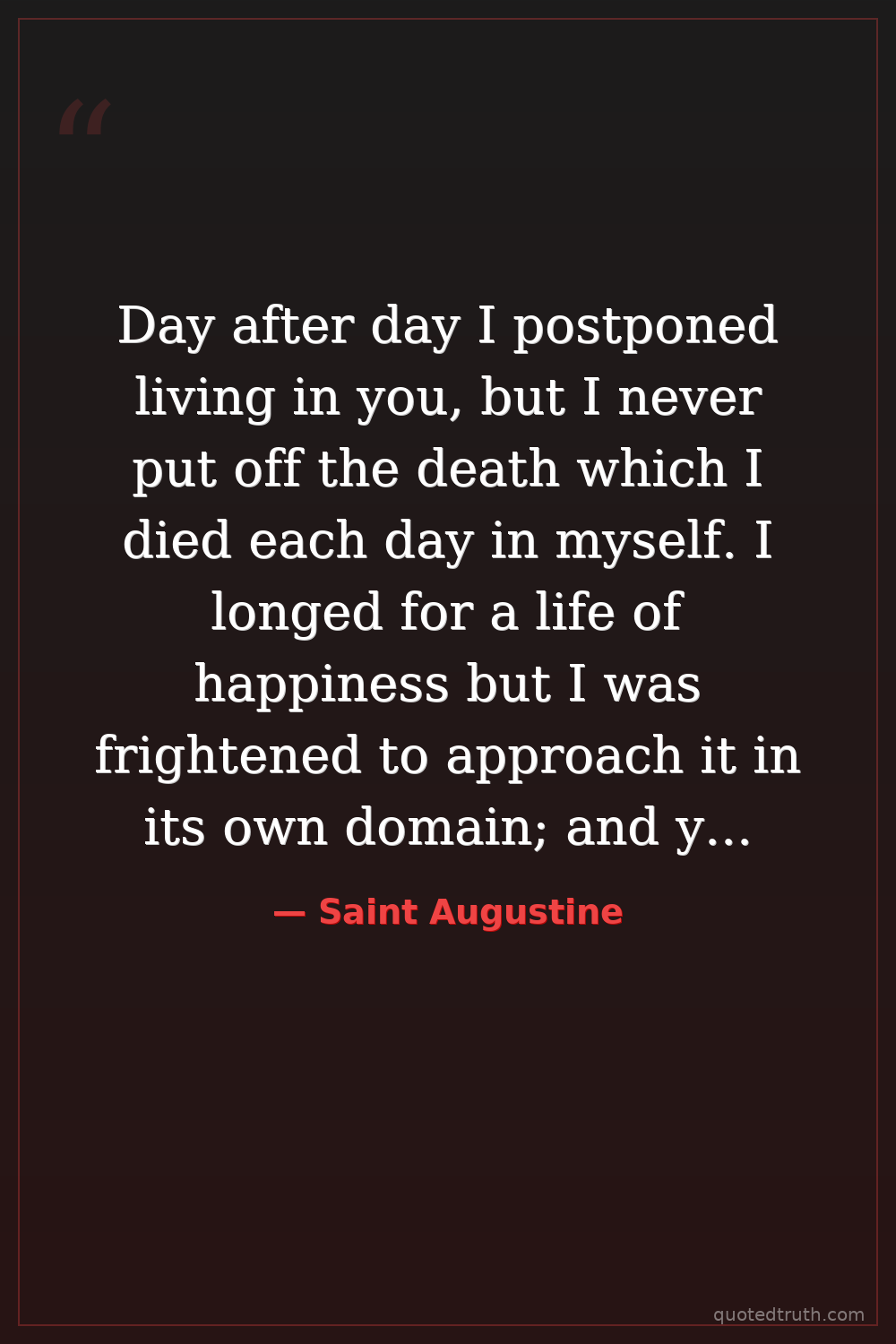 Day after day I postponed living in you, but I never put off the death which I died each day in myself. I longed for a life of happiness but I was frightened to approach it in its own domain; and yet, while I fled from it, I still searched for it.