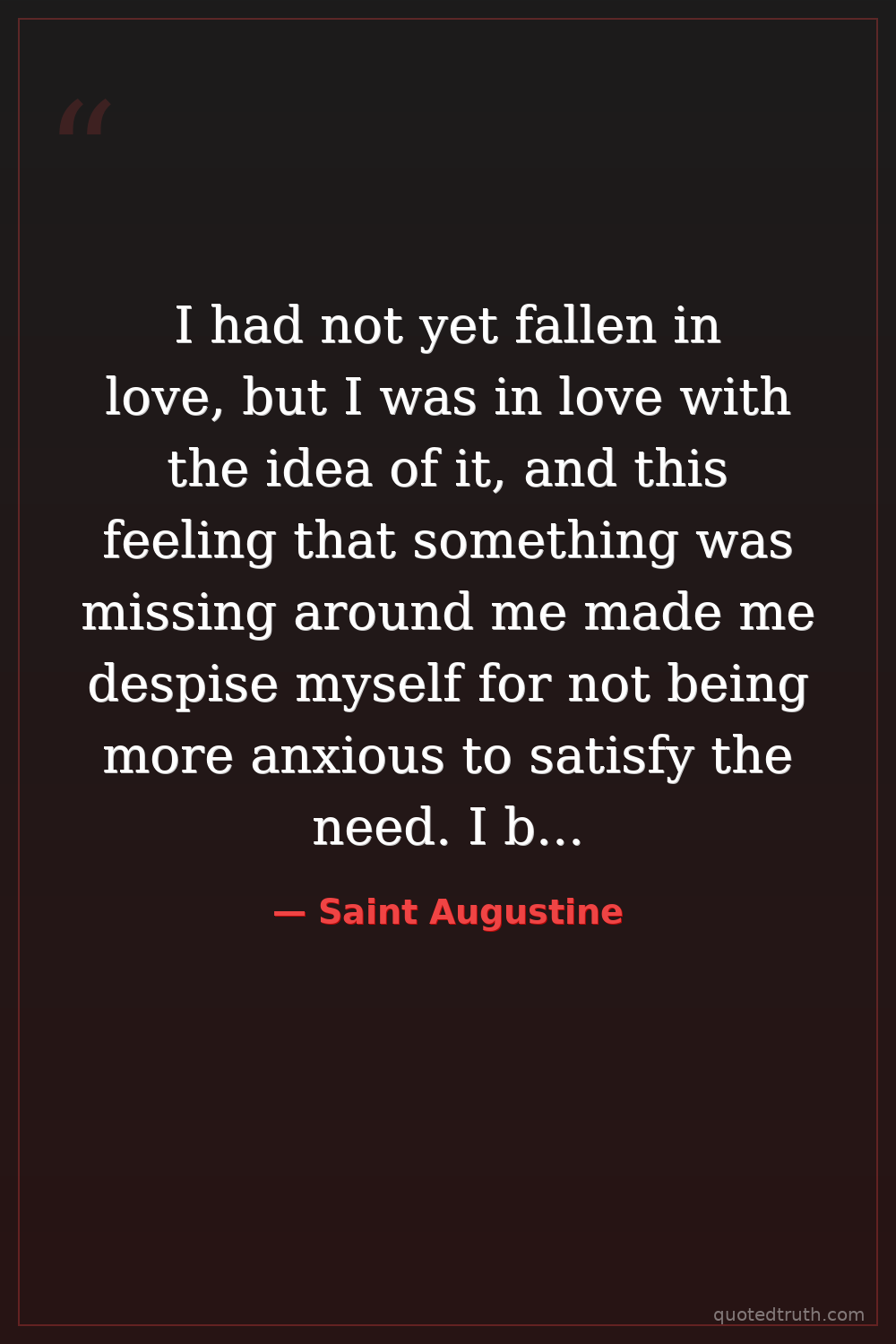 I had not yet fallen in love, but I was in love with the idea of it, and this feeling that something was missing around me made me despise myself for not being more anxious to satisfy the need. I began to look around for some object for my love, since I badly wanted to love something.