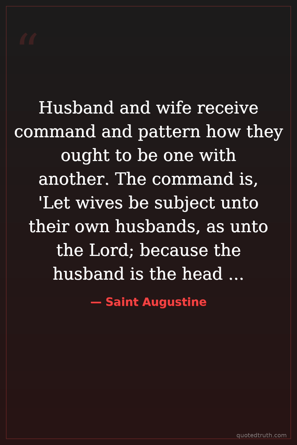 Husband and wife receive command and pattern how they ought to be one with another. The command is, 'Let wives be subject unto their own husbands, as unto the Lord; because the husband is the head of the wife;' and, 'Husbands, love your wives.'