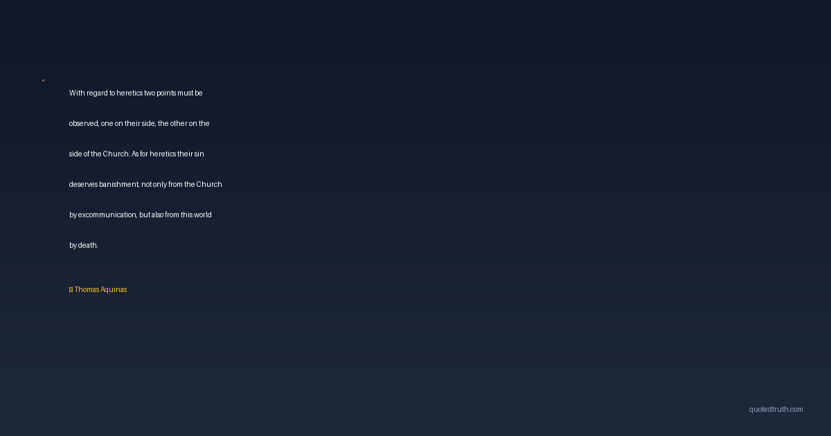 With regard to heretics two points must be observed, one on their side, the other on the side of the Church. As for heretics their sin deserves banishment, not only from the Church by excommunication, but also from this world by death.