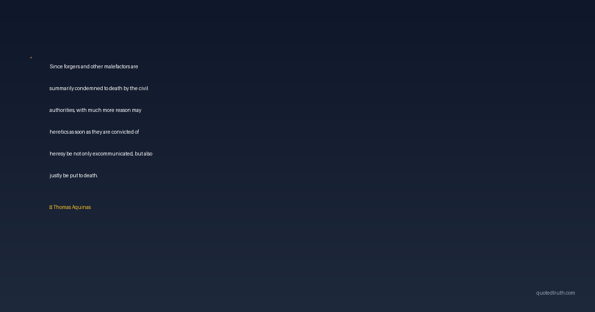 Since forgers and other malefactors are summarily condemned to death by the civil authorities, with much more reason may heretics as soon as they are convicted of heresy be not only excommunicated, but also justly be put to death.