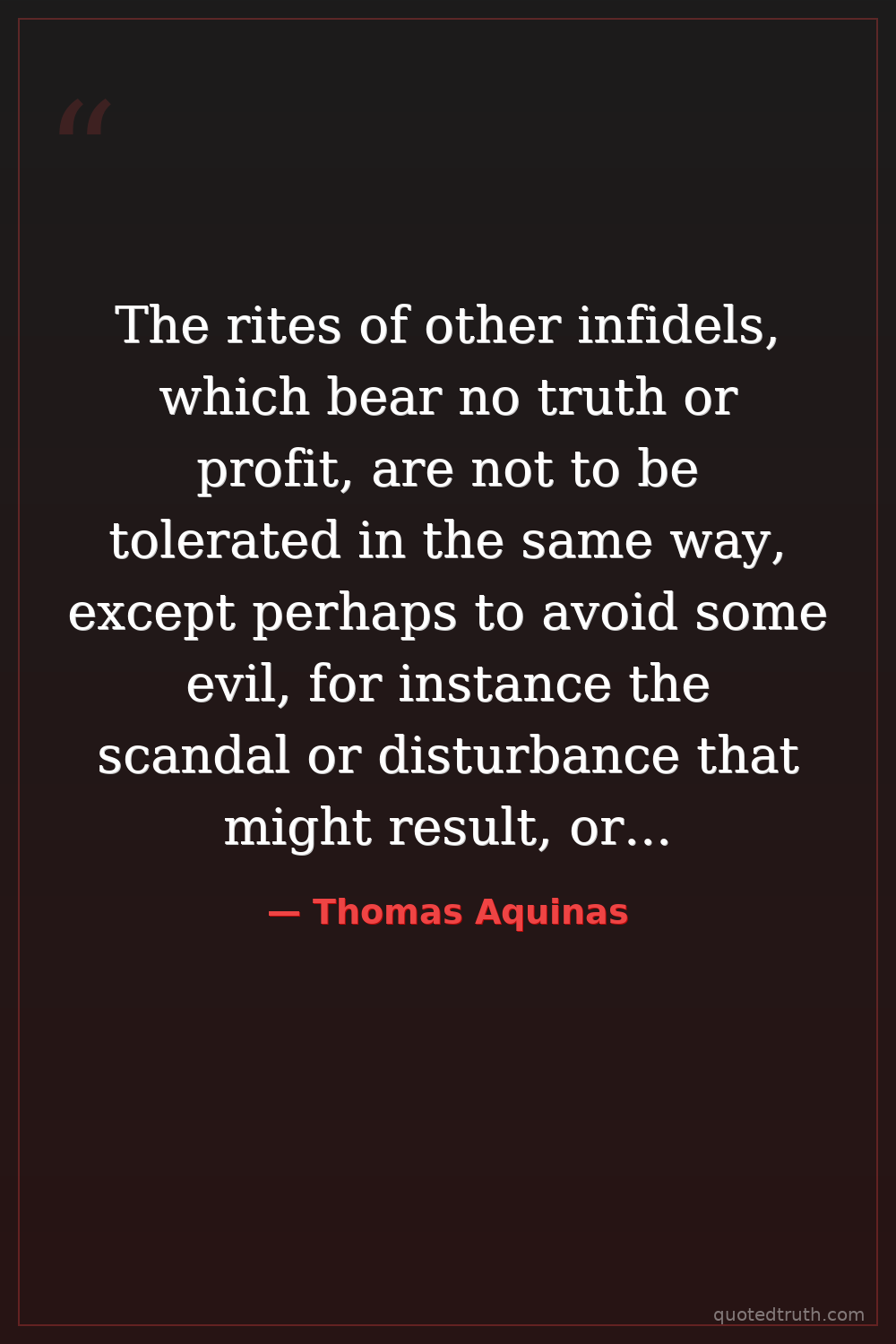 The rites of other infidels, which bear no truth or profit, are not to be tolerated in the same way, except perhaps to avoid some evil, for instance the scandal or disturbance that might result, or the hindrance to the salvation of those who, were they unmolested, might gradually be converted to the faith.