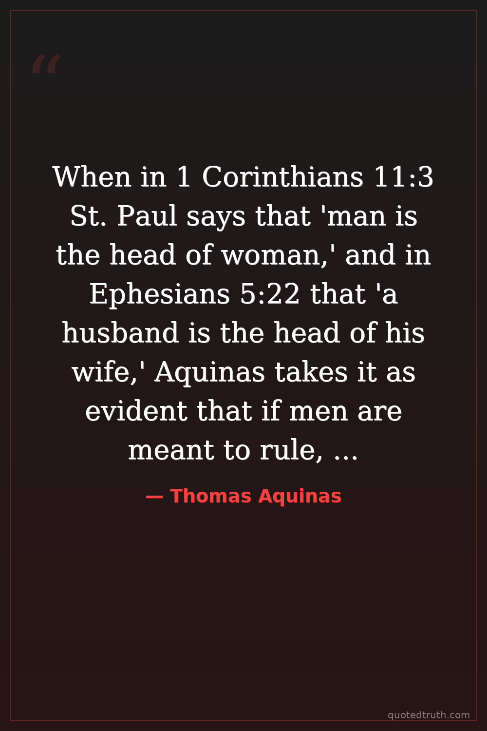 When in 1 Corinthians 11:3 St. Paul says that 'man is the head of woman,' and in Ephesians 5:22 that 'a husband is the head of his wife,' Aquinas takes it as evident that if men are meant to rule, it can only be by virtue of intellectual superiority.