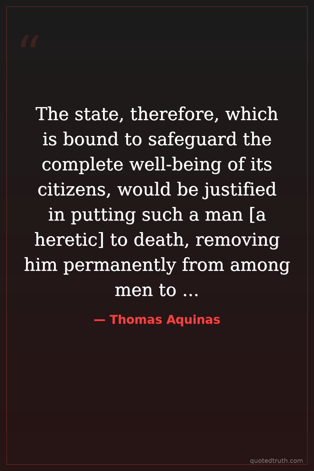 The state, therefore, which is bound to safeguard the complete well-being of its citizens, would be justified in putting such a man [a heretic] to death, removing him permanently from among men to whom he can do so much damage. — Thomas Aquinas Medieval Catholic philosopher and theologian