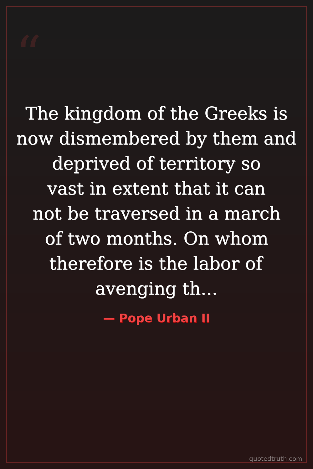 The kingdom of the Greeks is now dismembered by them and deprived of territory so vast in extent that it can not be traversed in a march of two months. On whom therefore is the labor of avenging these wrongs and of recovering this territory incumbent, if not upon you?