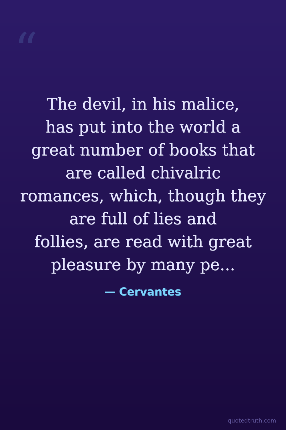 The devil, in his malice, has put into the world a great number of books that are called chivalric romances, which, though they are full of lies and follies, are read with great pleasure by many people.