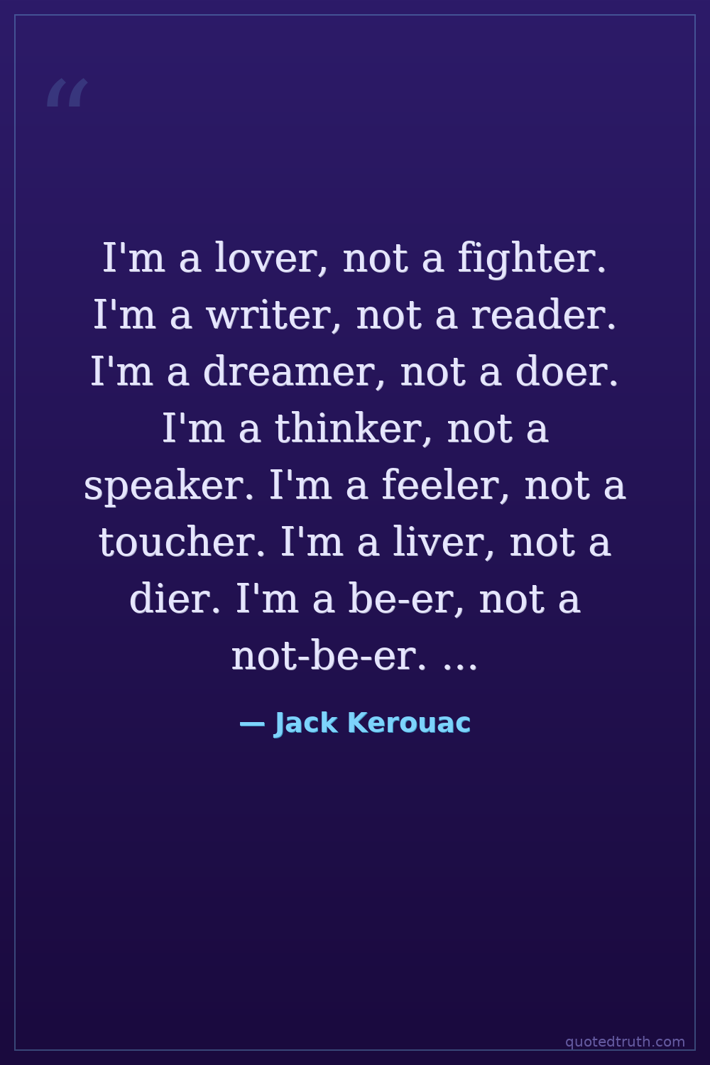I'm a lover, not a fighter. I'm a writer, not a reader. I'm a dreamer, not a doer. I'm a thinker, not a speaker. I'm a feeler, not a toucher. I'm a liver, not a dier. I'm a be-er, not a not-be-er. I'm a.