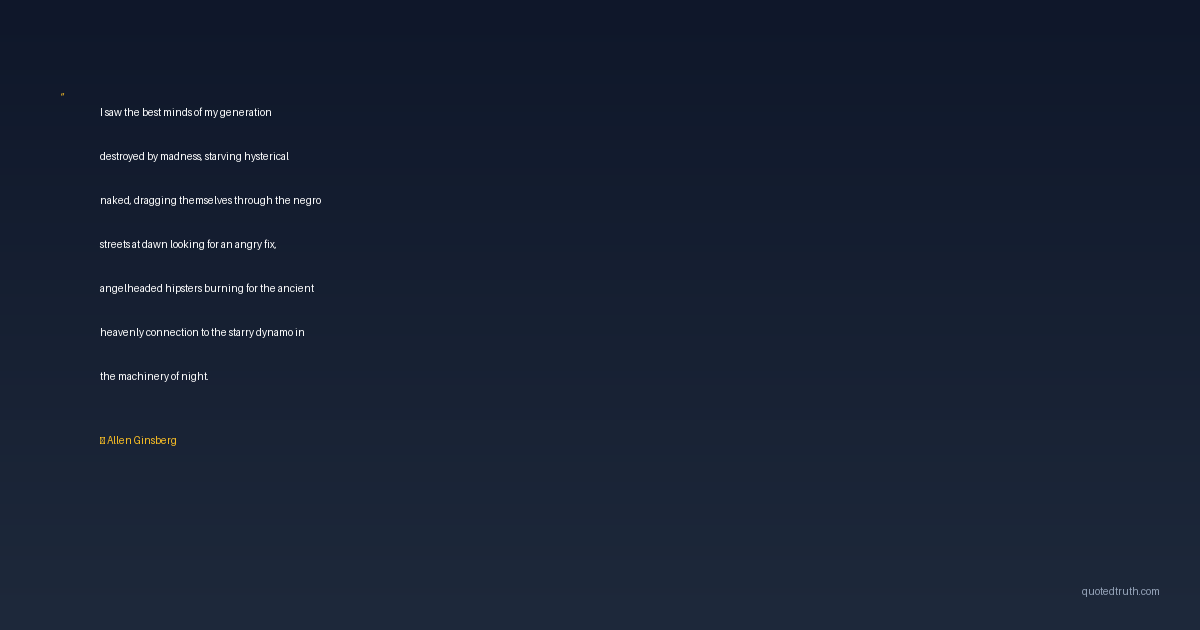 I saw the best minds of my generation destroyed by madness, starving hysterical naked, dragging themselves through the negro streets at dawn looking for an angry fix, angelheaded hipsters burning for the ancient heavenly connection to the starry dynamo in the machinery of night.