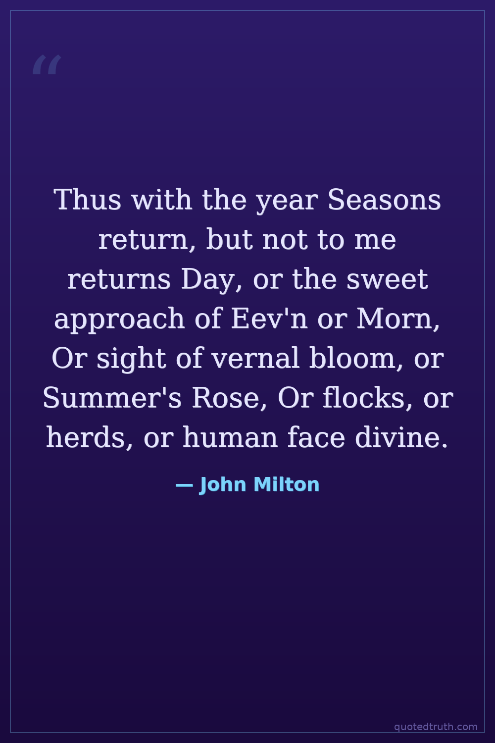 Thus with the year Seasons return, but not to me returns Day, or the sweet approach of Eev'n or Morn, Or sight of vernal bloom, or Summer's Rose, Or flocks, or herds, or human face divine.