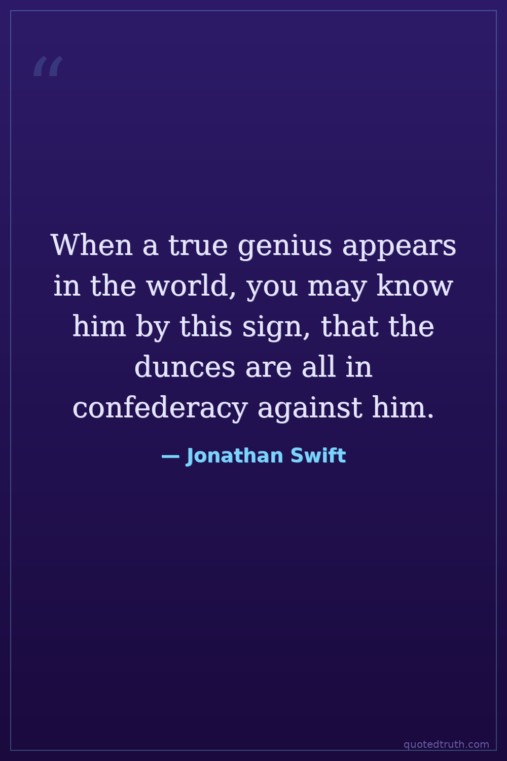 When a true genius appears in the world, you may know him by this sign, that the dunces are all in confederacy against him.