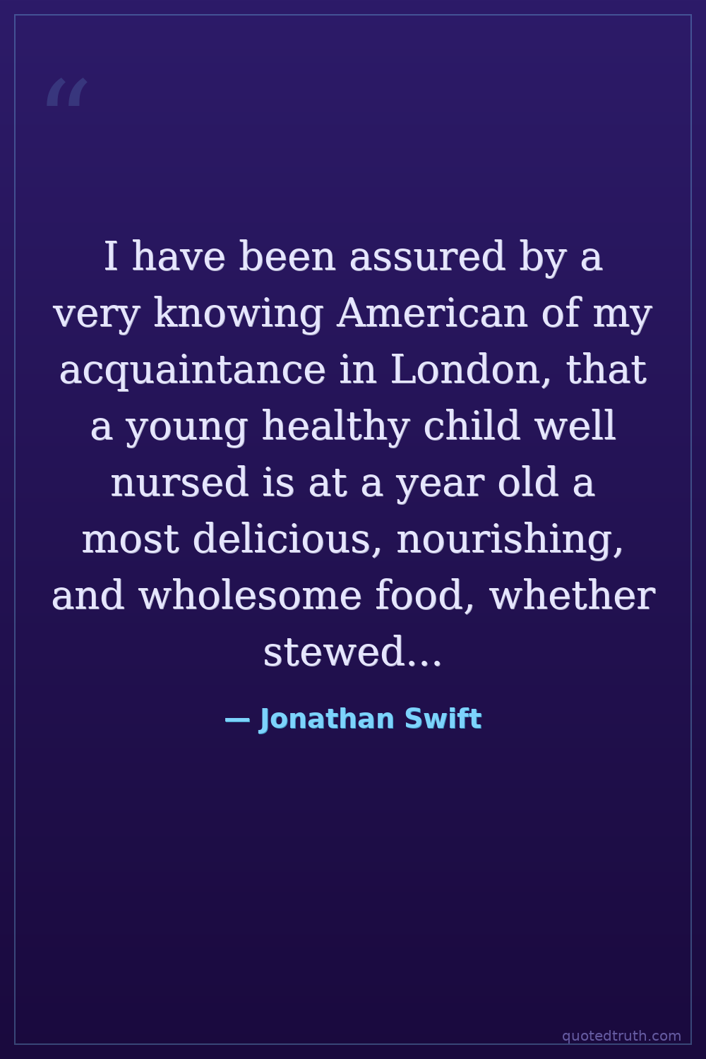I have been assured by a very knowing American of my acquaintance in London, that a young healthy child well nursed is at a year old a most delicious, nourishing, and wholesome food, whether stewed, roasted, baked, or boiled; and I make no doubt that it will equally serve in a fricassee or a ragout.