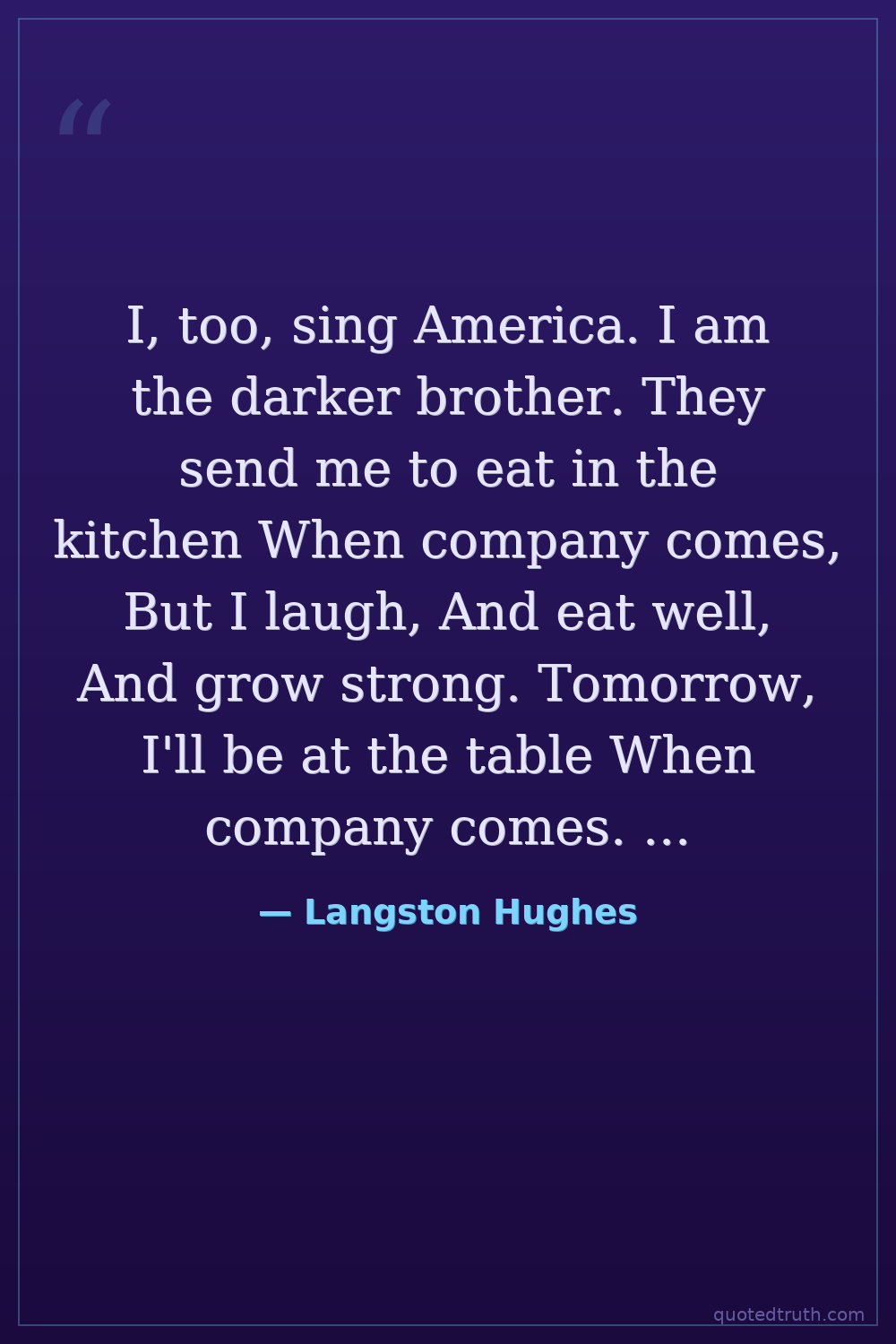 I, too, sing America. I am the darker brother. They send me to eat in the kitchen When company comes, But I laugh, And eat well, And grow strong. Tomorrow, I'll be at the table When company comes. Nobody'll dare Say to me, 'Eat in the kitchen,' Then. Besides, They'll see how beautiful I am And be ashamed— I, too, am America.