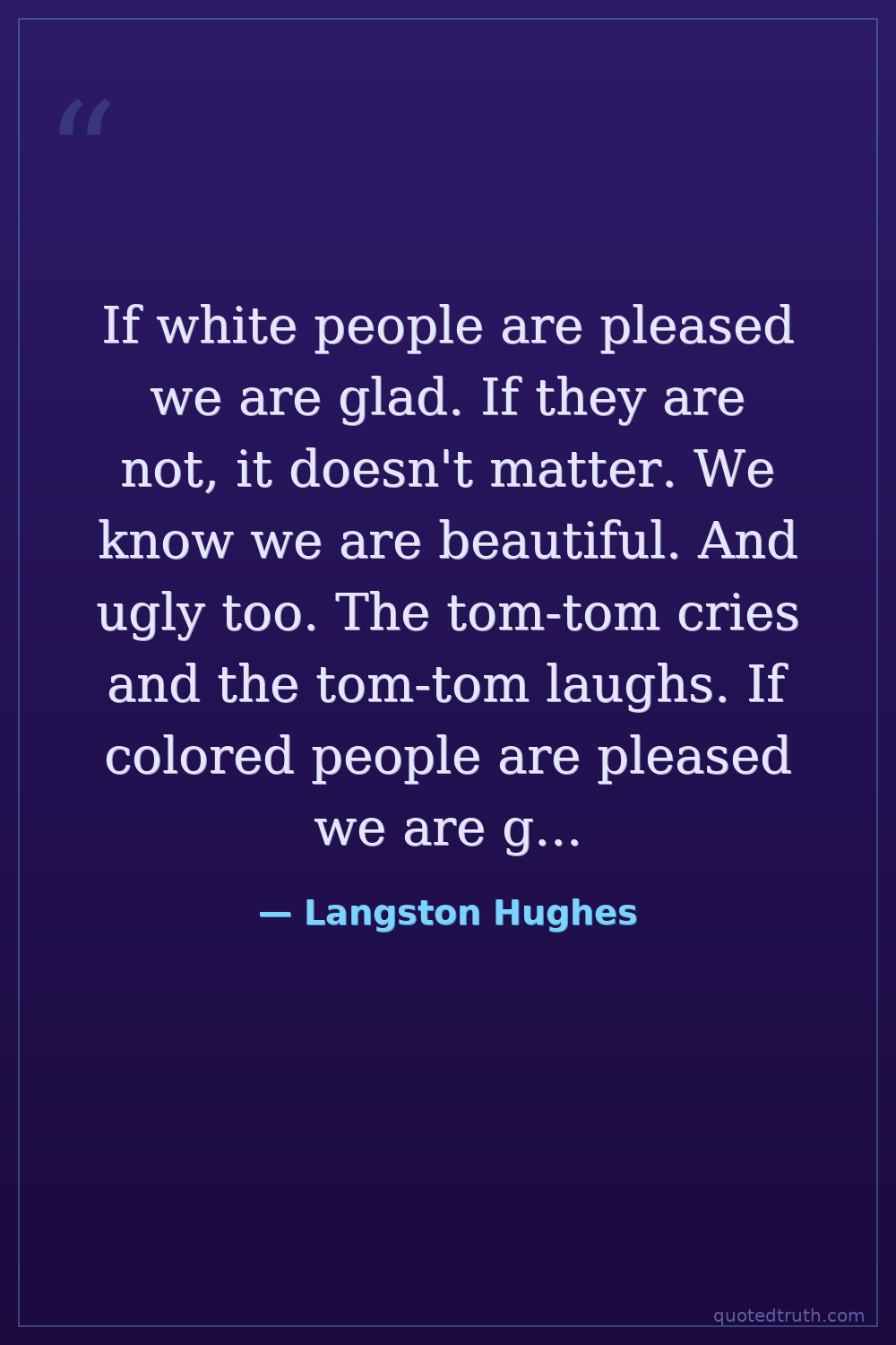 If white people are pleased we are glad. If they are not, it doesn't matter. We know we are beautiful. And ugly too. The tom-tom cries and the tom-tom laughs. If colored people are pleased we are glad. If they are not, their displeasure doesn't matter either. We build our temples for tomorrow, strong as we know how, and we stand on top of the mountain, free within ourselves.