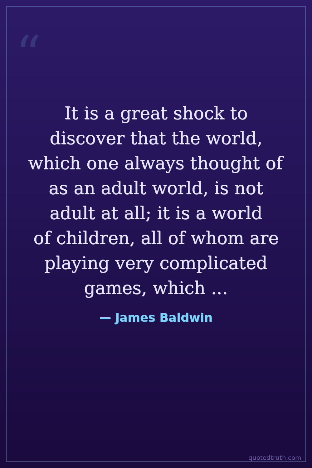 It is a great shock to discover that the world, which one always thought of as an adult world, is not adult at all; it is a world of children, all of whom are playing very complicated games, which they make up as they go along. — James Baldwin Modern Novelist, essayist, civil rights