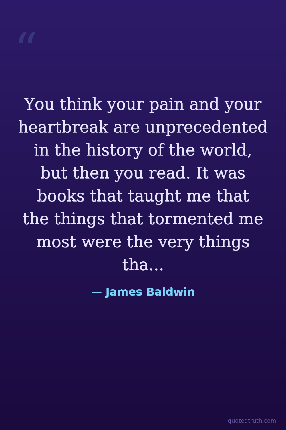 You think your pain and your heartbreak are unprecedented in the history of the world, but then you read. It was books that taught me that the things that tormented me most were the very things that connected me with all the people who were alive, or who had ever been alive.