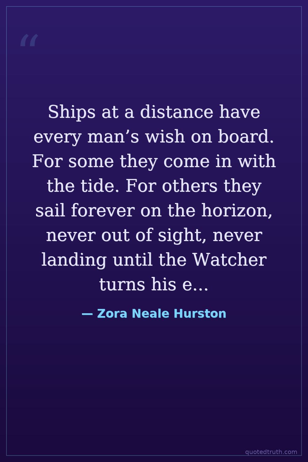 Ships at a distance have every man’s wish on board. For some they come in with the tide. For others they sail forever on the horizon, never out of sight, never landing until the Watcher turns his eyes away in resignation, his dreams mocked to death by Time. That is the life of men.