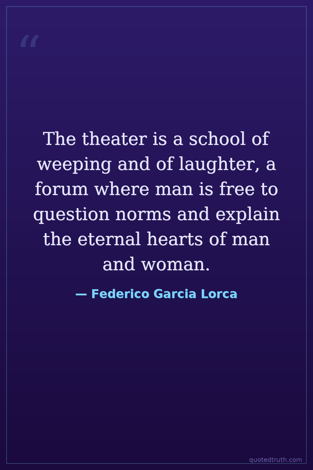 The theater is a school of weeping and of laughter, a forum where man is free to question norms and explain the eternal hearts of man and woman.