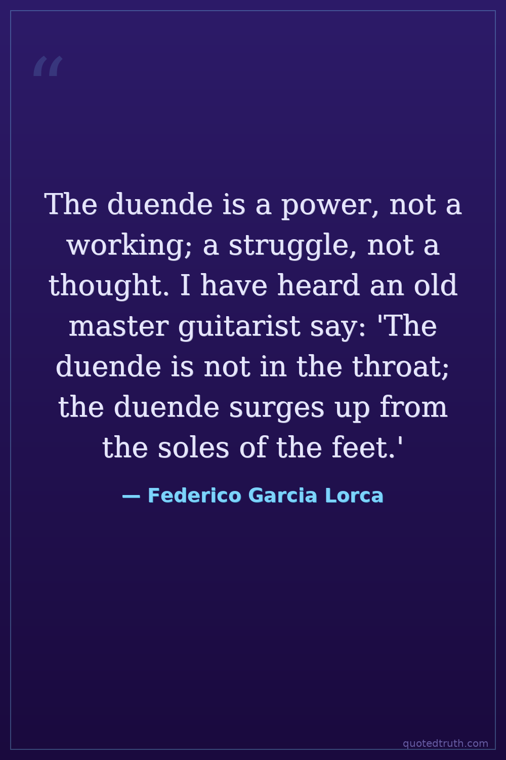 The duende is a power, not a working; a struggle, not a thought. I have heard an old master guitarist say: 'The duende is not in the throat; the duende surges up from the soles of the feet.'