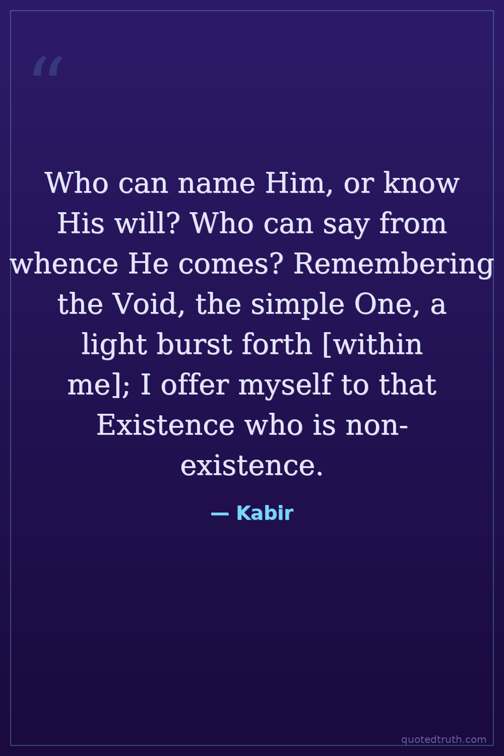 Who can name Him, or know His will? Who can say from whence He comes? Remembering the Void, the simple One, a light burst forth [within me]; I offer myself to that Existence who is non-existence.