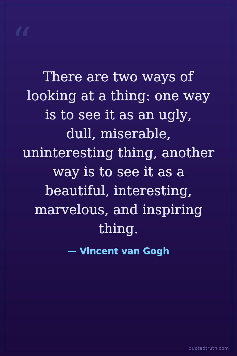 There are two ways of looking at a thing: one way is to see it as an ugly, dull, miserable, uninteresting thing, another way is to see it as a beautiful, interesting, marvelous, and inspiring thing.