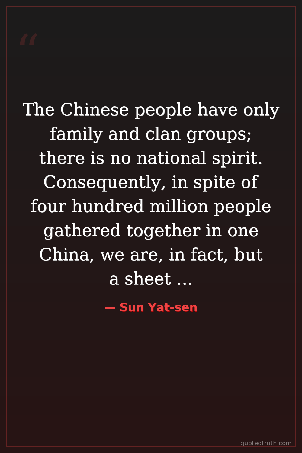 The Chinese people have only family and clan groups; there is no national spirit. Consequently, in spite of four hundred million people gathered together in one China, we are, in fact, but a sheet of loose sand.