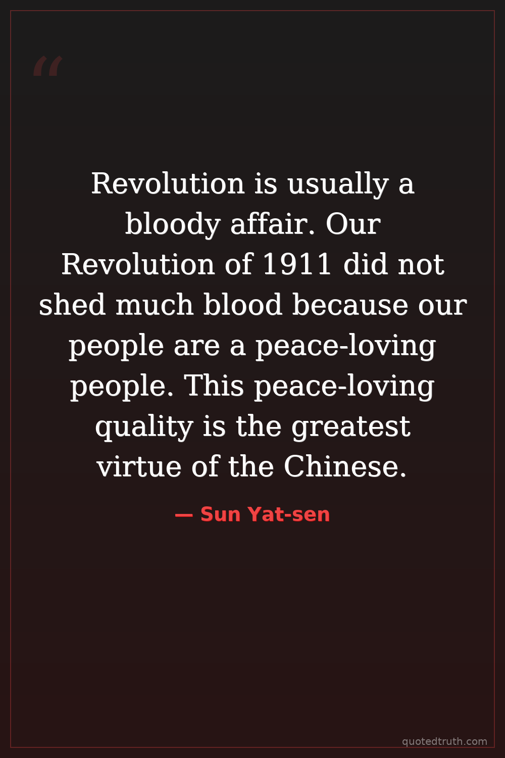 Revolution is usually a bloody affair. Our Revolution of 1911 did not shed much blood because our people are a peace-loving people. This peace-loving quality is the greatest virtue of the Chinese.