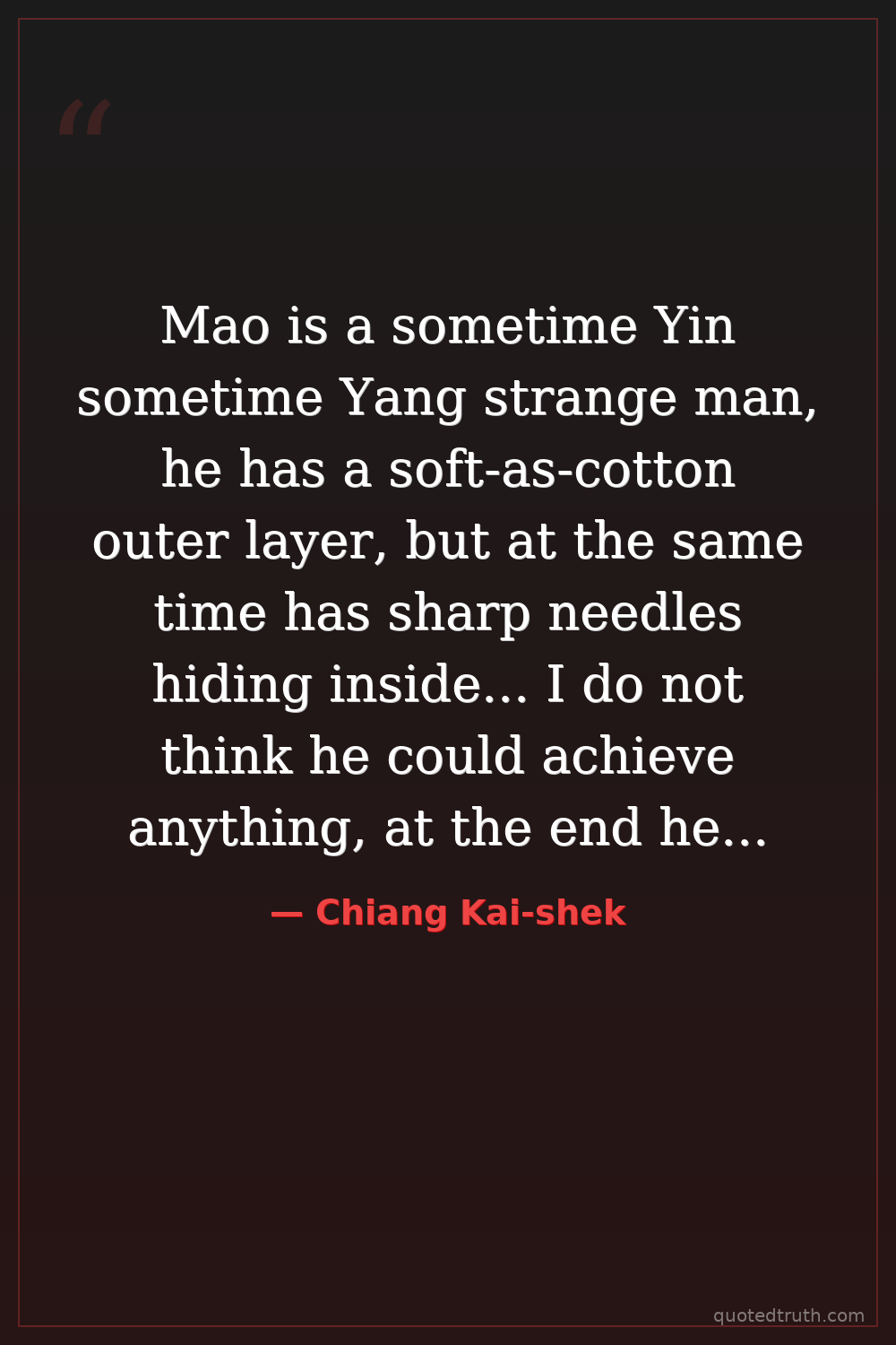 Mao is a sometime Yin sometime Yang strange man, he has a soft-as-cotton outer layer, but at the same time has sharp needles hiding inside... I do not think he could achieve anything, at the end he will be crushed inside my palm. — Chiang Kai-shek Modern Chinese Nationalist leader