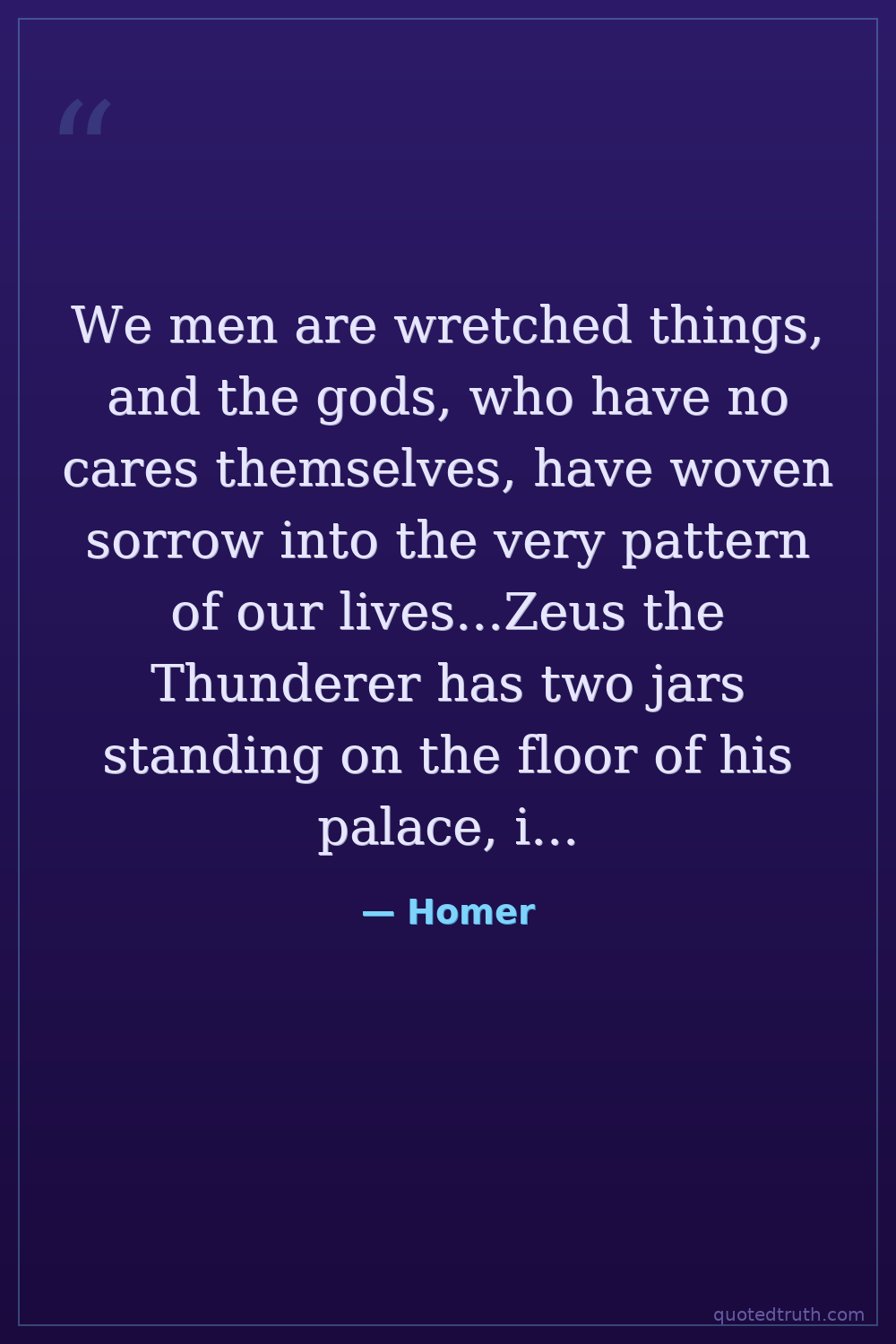 We men are wretched things, and the gods, who have no cares themselves, have woven sorrow into the very pattern of our lives...Zeus the Thunderer has two jars standing on the floor of his palace, in which he keeps his gifts, the evils in one and the blessings in the other.