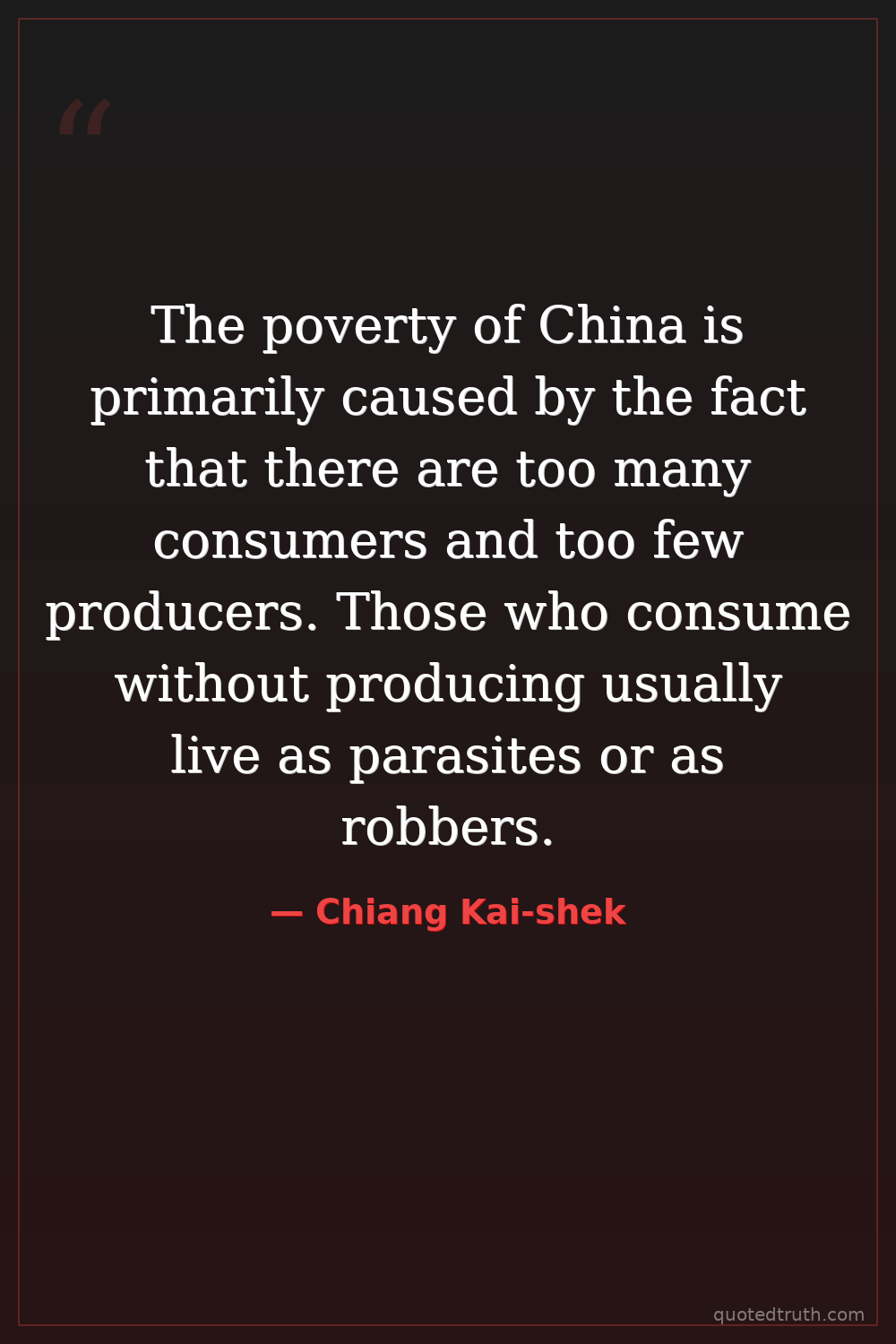 The poverty of China is primarily caused by the fact that there are too many consumers and too few producers. Those who consume without producing usually live as parasites or as robbers.
