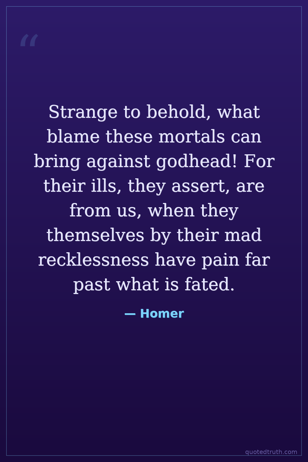 Strange to behold, what blame these mortals can bring against godhead! For their ills, they assert, are from us, when they themselves by their mad recklessness have pain far past what is fated.
