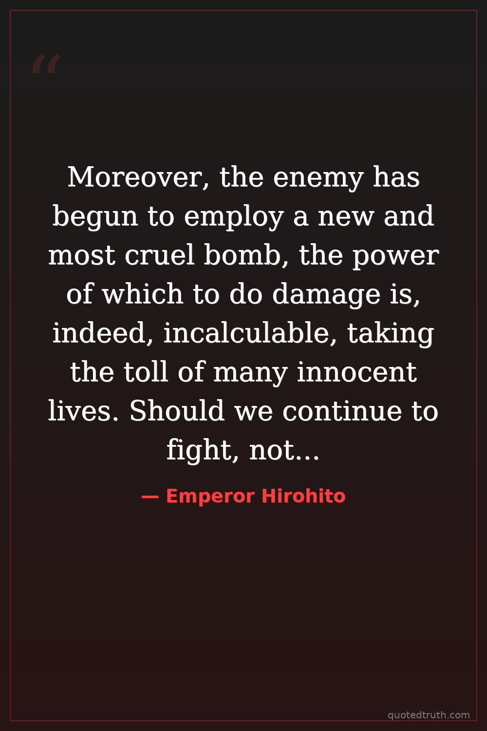 Moreover, the enemy has begun to employ a new and most cruel bomb, the power of which to do damage is, indeed, incalculable, taking the toll of many innocent lives. Should we continue to fight, not only would it result in an ultimate collapse and obliteration of the Japanese nation, but also it would lead to the total extinction of human civilization.