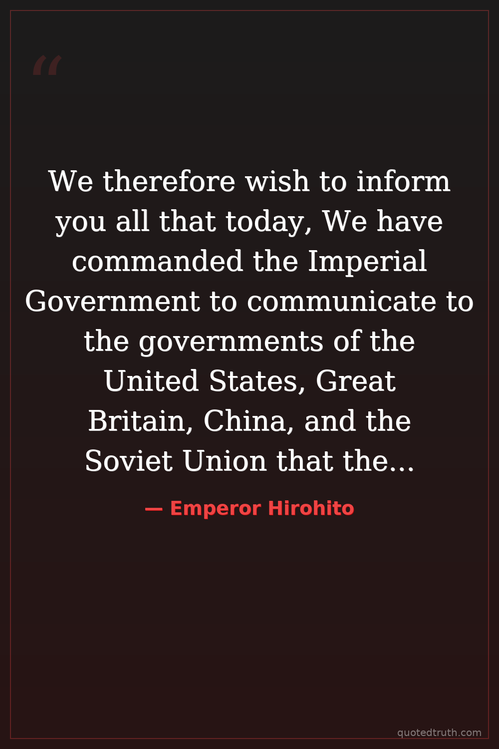 We therefore wish to inform you all that today, We have commanded the Imperial Government to communicate to the governments of the United States, Great Britain, China, and the Soviet Union that the Empire accepts the terms of their Joint Declaration.