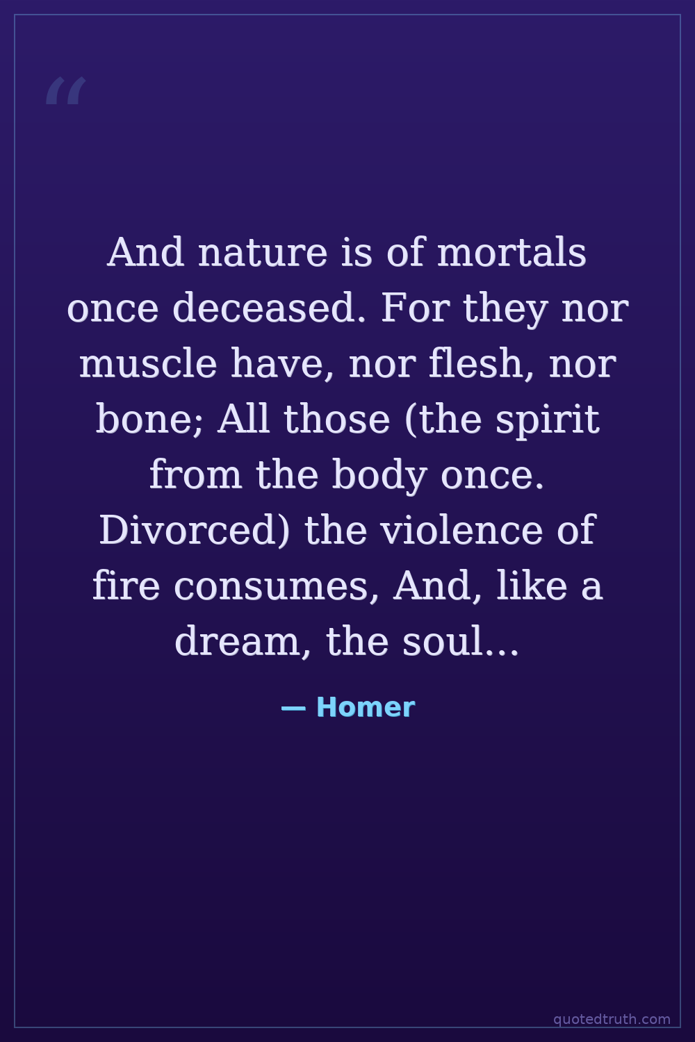 And nature is of mortals once deceased. For they nor muscle have, nor flesh, nor bone; All those (the spirit from the body once. Divorced) the violence of fire consumes, And, like a dream, the soul flies swift away.