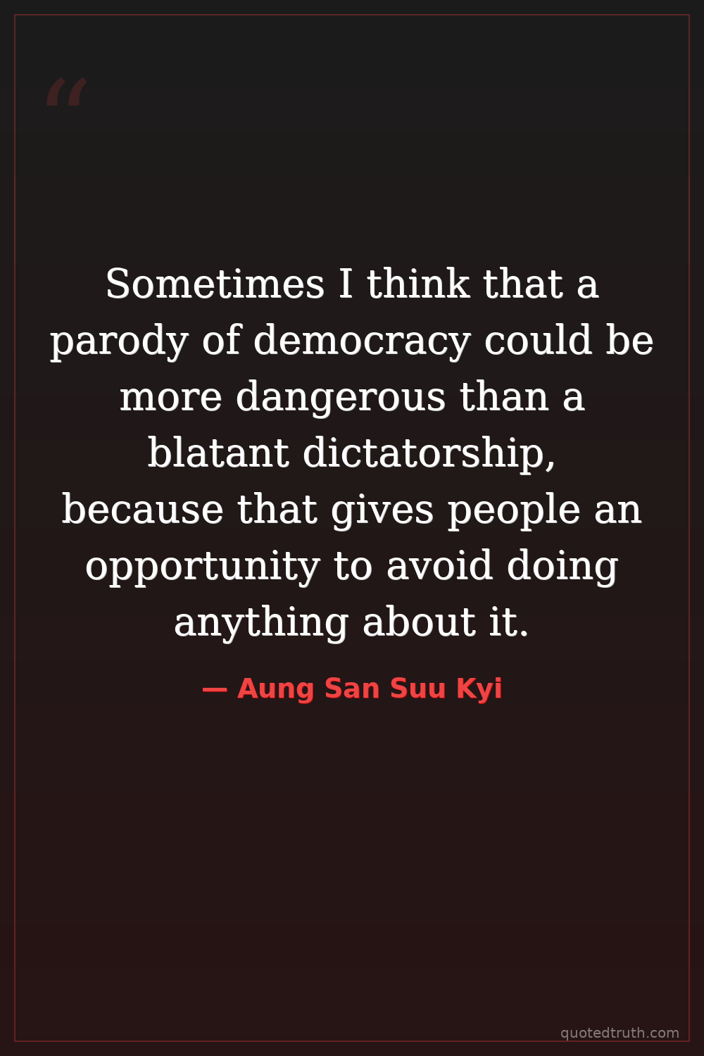 Sometimes I think that a parody of democracy could be more dangerous than a blatant dictatorship, because that gives people an opportunity to avoid doing anything about it.