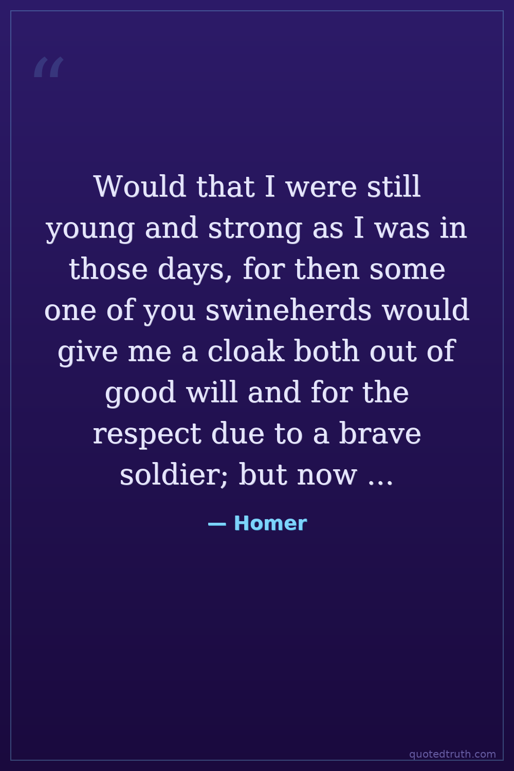 Would that I were still young and strong as I was in those days, for then some one of you swineherds would give me a cloak both out of good will and for the respect due to a brave soldier; but now people look down upon me because my clothes are shabby.