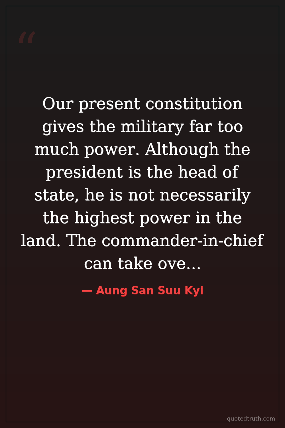 Our present constitution gives the military far too much power. Although the president is the head of state, he is not necessarily the highest power in the land. The commander-in-chief can take over all powers of government at any time he feels it to be necessary.