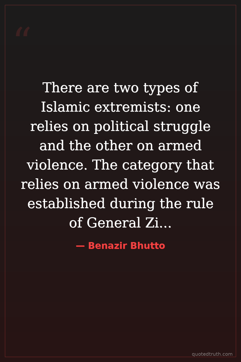 There are two types of Islamic extremists: one relies on political struggle and the other on armed violence. The category that relies on armed violence was established during the rule of General Zia. These pro-Zia fundamentalist forces are international in nature due to the Afghan war. They have infiltrated the security apparatus and are a threat to democracy in Pakistan as well as to regional peace.